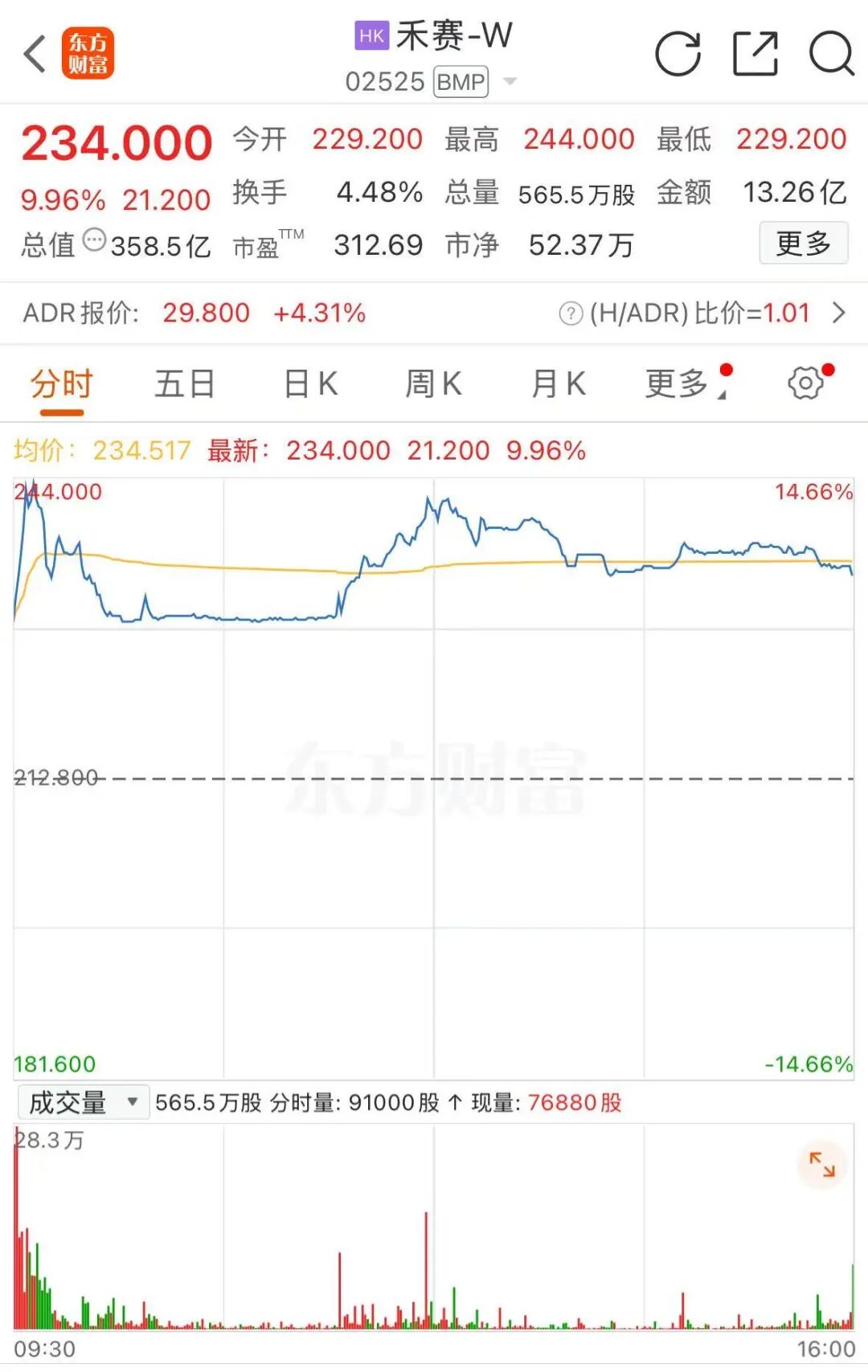 禾赛科技港股开盘后,股价一度大涨14.66%。截至收盘,禾赛科技报价234港元/股,涨幅达9.96%,总市值为358.5亿港元。