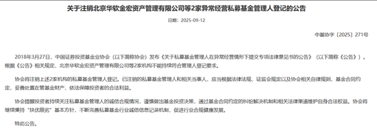 近日,中基协发布公告称,北京华软金宏资产管理有限公司等2家机构不能持续符合管理人登记要求,协会将注销2家机构的私募基金管理人登记。